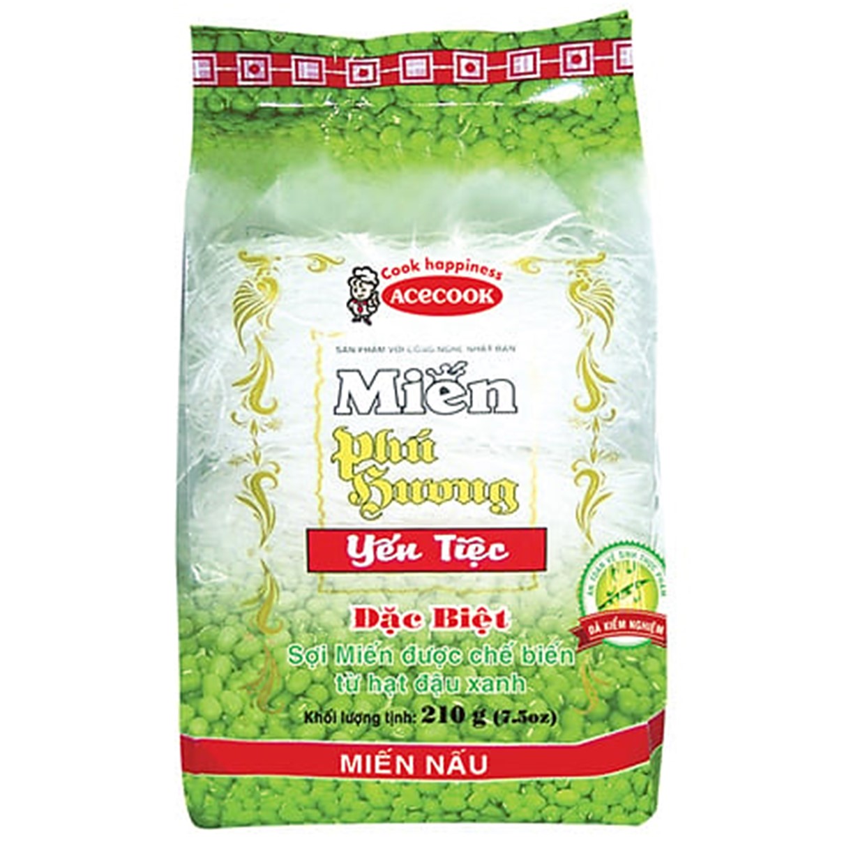 Yen Tiec Phu Huong Vina Acecook Green Bean Vermicelli 210g pack. It features round, small vermicelli strands in white color, made from green bean flour. Simply soak the vermicelli in water for a few minutes, and it's ready to be cooked according to individual preferences. Phu Huong Vermicelli is of high quality, trusted and chosen by many housewives for their kitchen needs.