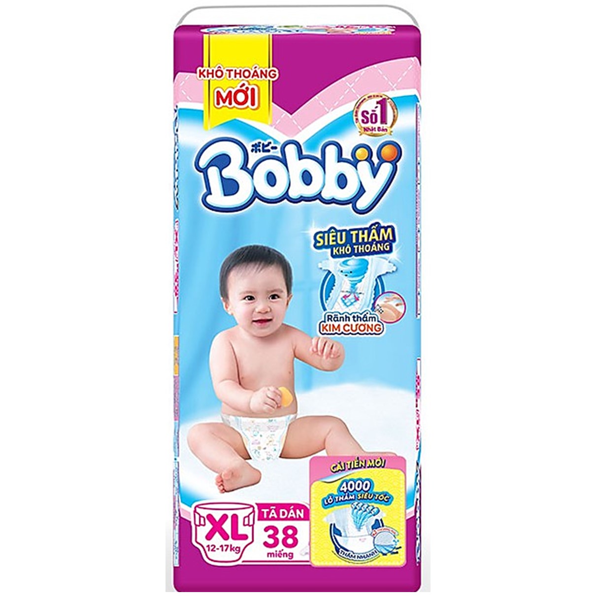 Furthermore, Bobby diapers are equipped with 4000 super-fast absorption holes and a Flexi-fit elastic system to ensure the baby stays comfortable and dry throughout the day. Bobby diapers provide babies with moments of joyful play and deep, restful sleep. To achieve this, the Japanese brand Unicharm has researched and produced diapers with outstanding features such as the flexible Magic Fit system, snugly fitting the baby's belly, soft cotton front waistband, safe for delicate skin, and a 3D super-absorbent surface. Additionally, the improved feature of diamond-absorbing grooves makes Bobby diapers the perfect choice for mothers.