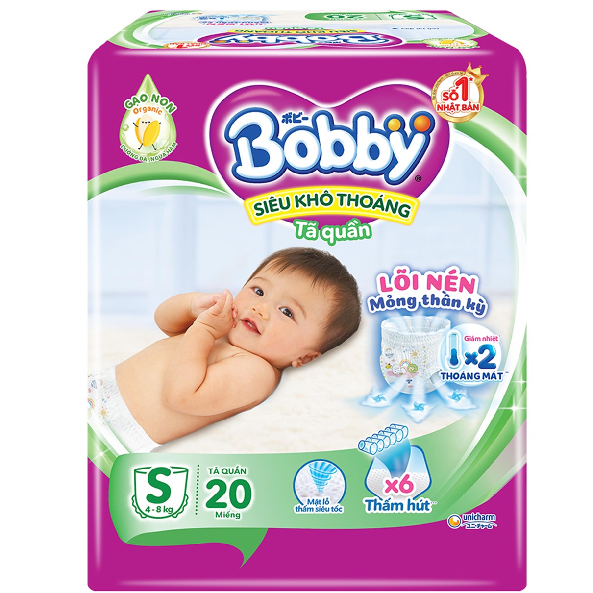 Furthermore, Bobby diapers are equipped with 4000 super-fast absorption holes and a Flexi-fit elastic system to ensure the baby stays comfortable and dry throughout the day. Bobby diapers provide babies with moments of joyful play and deep, restful sleep. To achieve this, the Japanese brand Unicharm has researched and produced diapers with outstanding features such as the flexible Magic Fit system, snugly fitting the baby's belly, soft cotton front waistband, safe for delicate skin, and a 3D super-absorbent surface. Additionally, the improved feature of diamond-absorbing grooves makes Bobby diapers the perfect choice for mothers.