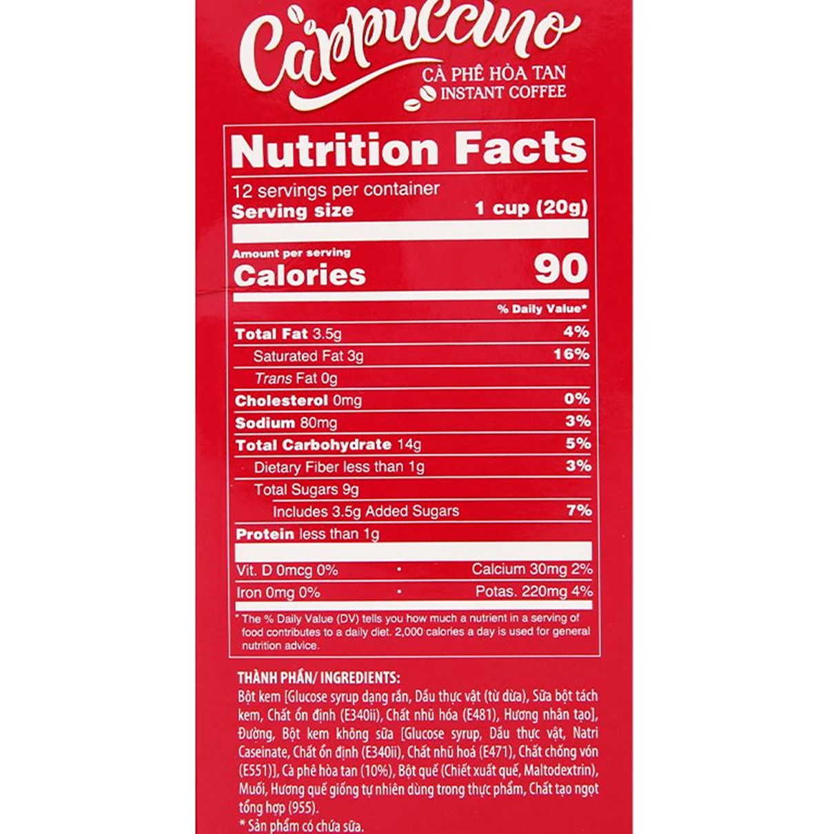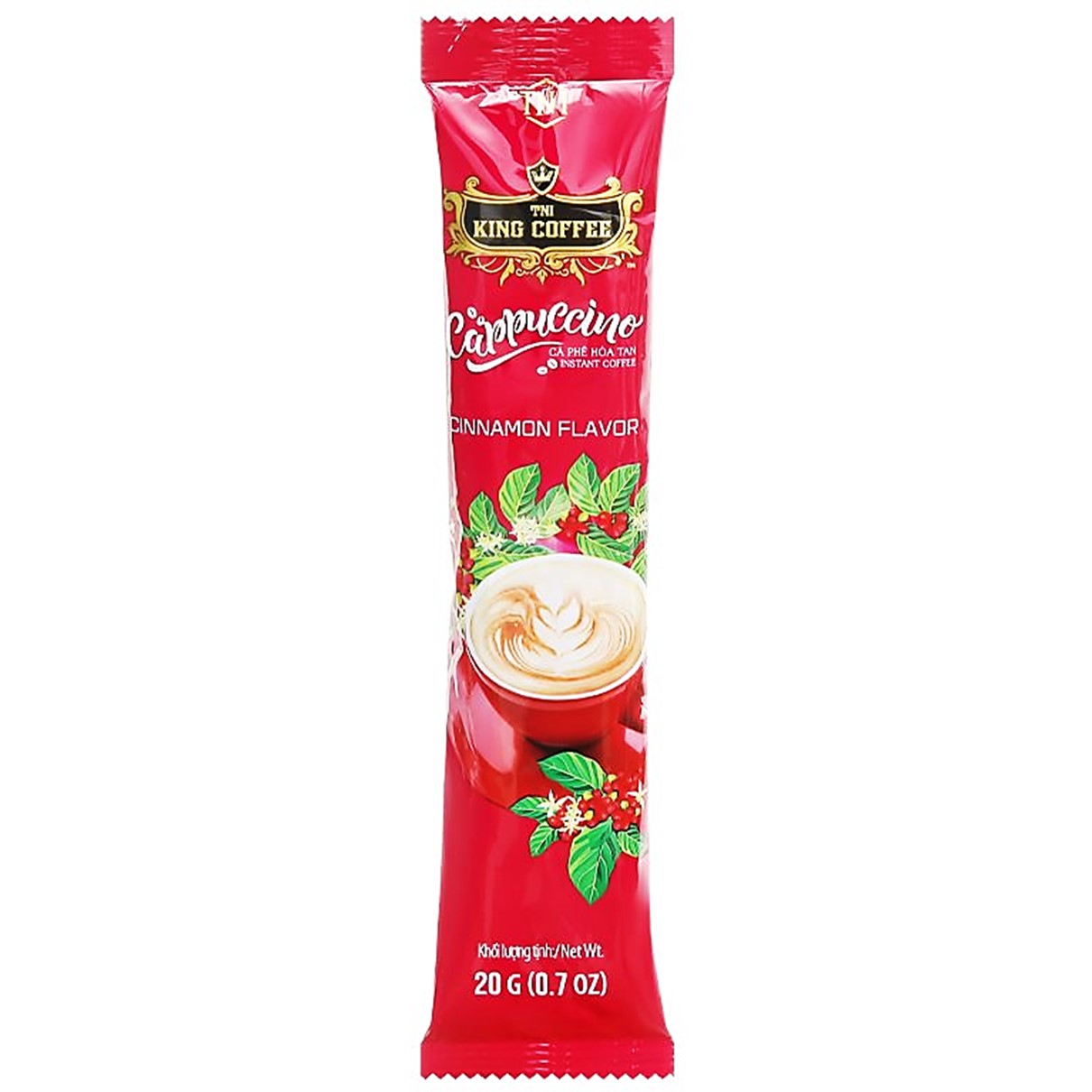 Crafted from 100% Arabica coffee beans blended with cinnamon-flavored creamer, sugar, and non-dairy creamer. Through a modern process combined with a specialized brewing formula from TNI King Coffee experts, the Cappuccino TNI King Coffee product ensures quality for an energizing start to your day