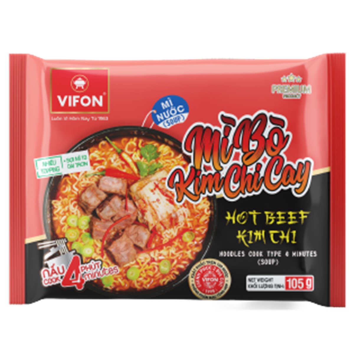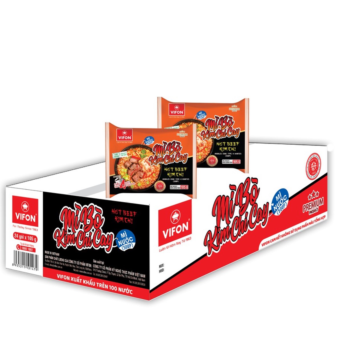 Hot beef Kim chi instant Noodles is produced by modern technology, the beef flavor combined with Kimchi makes the dish richer and attractive, the noodles are round, smooth, absorbent, and without synthetic color. So many toppings will bring you a nutritious meal!